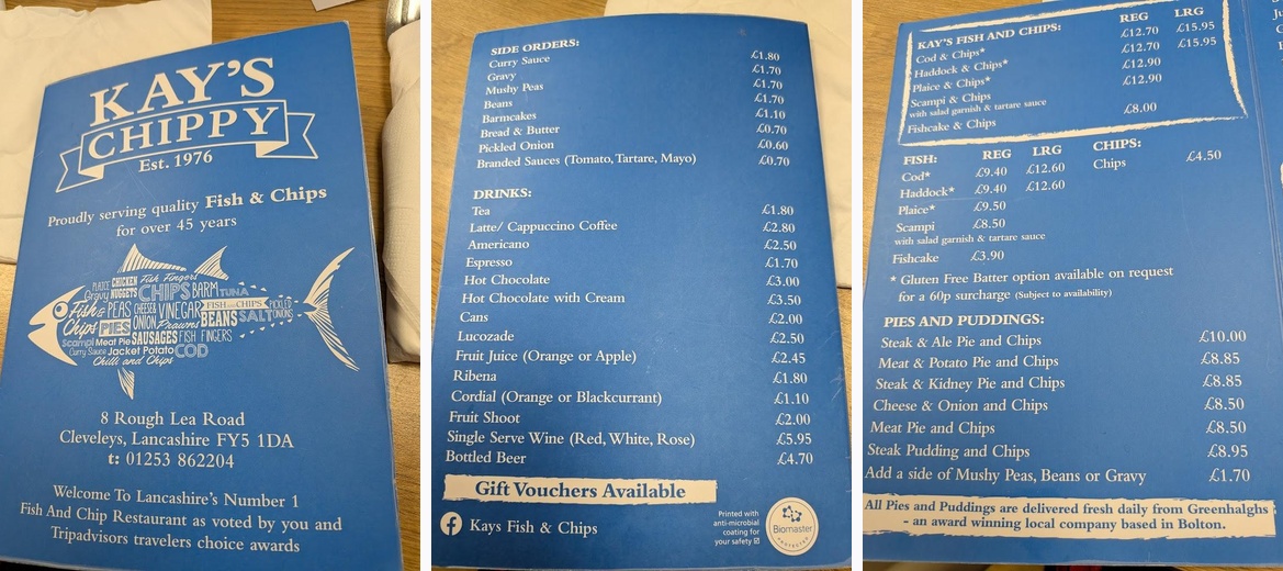 Savor the best fish and chips at Kay’s Fish & Chips in Cleveleys! Enjoy quick service, gluten-free options, and our famous plaice with butter and mushy peas. Perfect for lunch or a cozy takeaway with your dog. Visit us at 8 Rough Lea Rd, or call +44 1253 862204.
